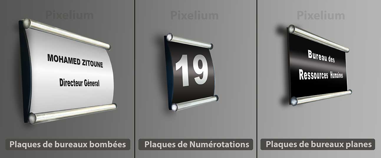 ' Plaque murale de signalétique avec : une face bombée en Aluminiumune face plane en AluminiumProtection transparente anti-refle.Livré avec fixations double face |