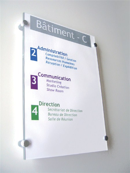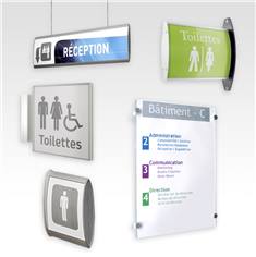 La signalétique intérieure La signalétique intérieure ou encore signalétique interne vous permet d'orienter, d'informer et d'augmenter la visibilité de votre communication. Ainsi, les plaques de porte, les porte visuels muraux, les portes étiquettes etc. participent à l'image de marque de votre entreprise. |